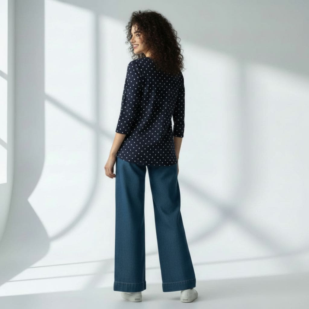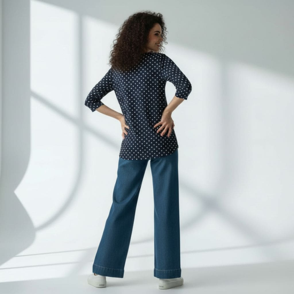This Polka Navy Cotton Poplin Short Kurta has a V-Notch Neck and three-quarter sleeves. It has a relaxed fit and regular length. Made from cotton, it is soft and comfortable to wear.