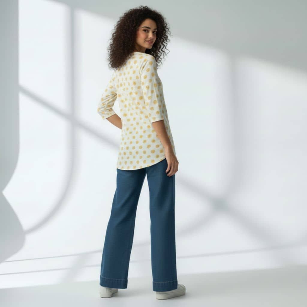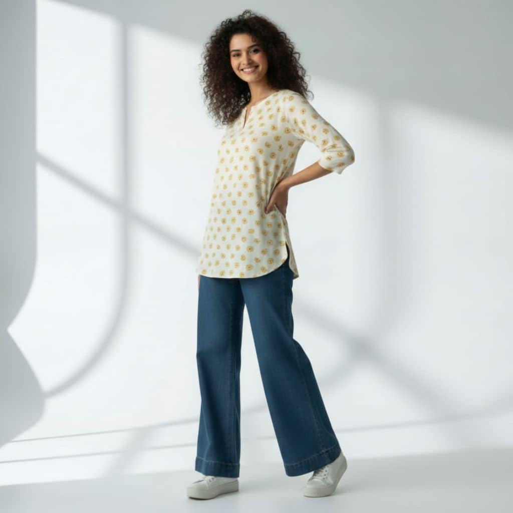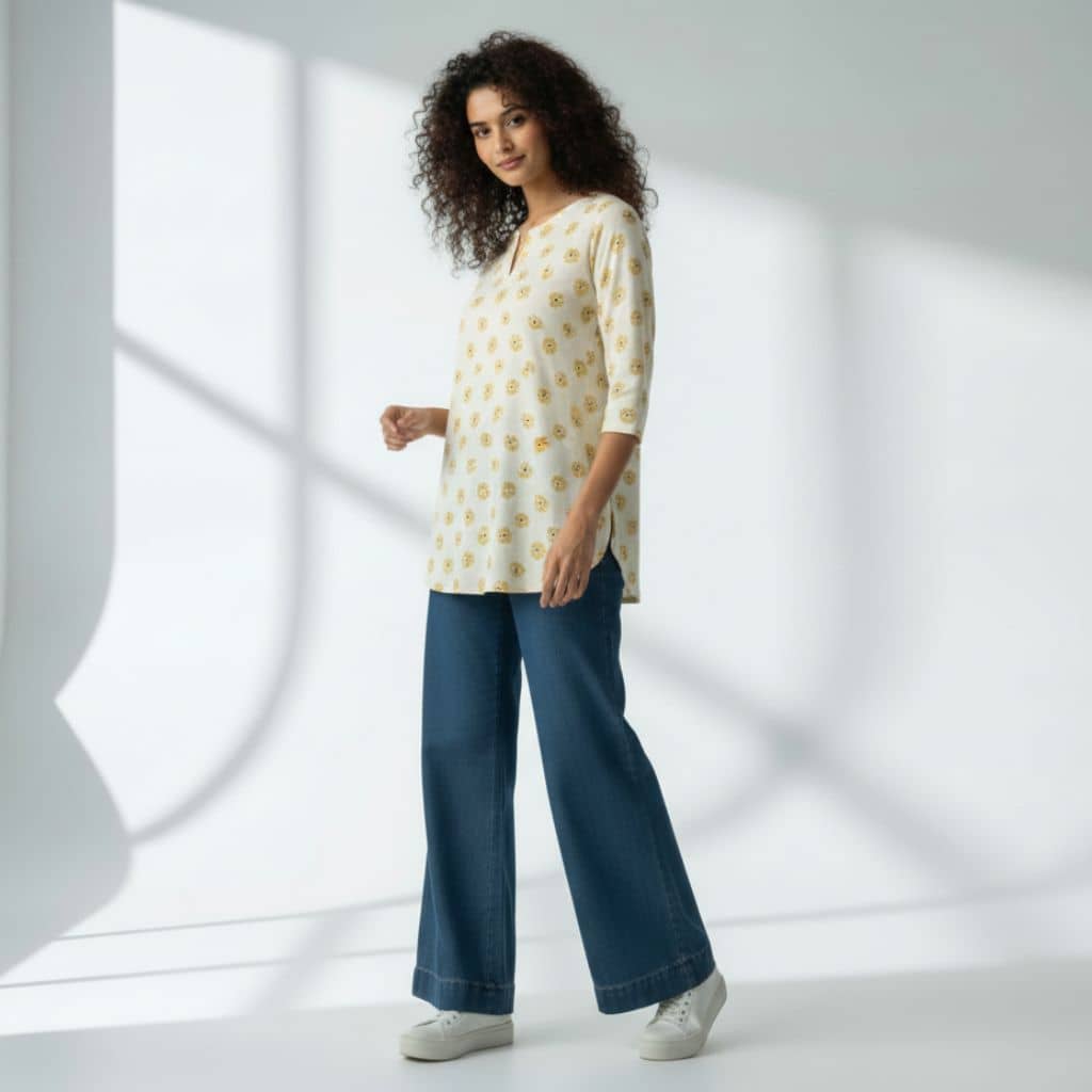 This Floral Cream Cotton Short Kurta has a V-Notch Neck and three-quarter sleeves. It has a relaxed fit and regular length. Made from cotton, it is soft and comfortable to wear.