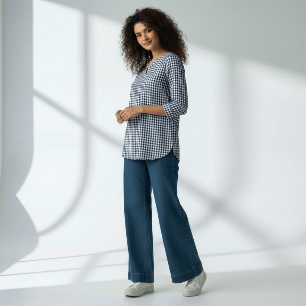 The Gingham Check Cotton V-Notch Neck Short Kurta