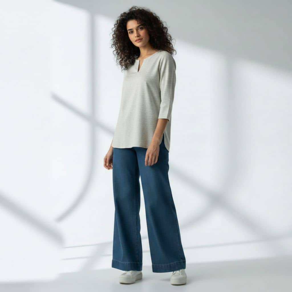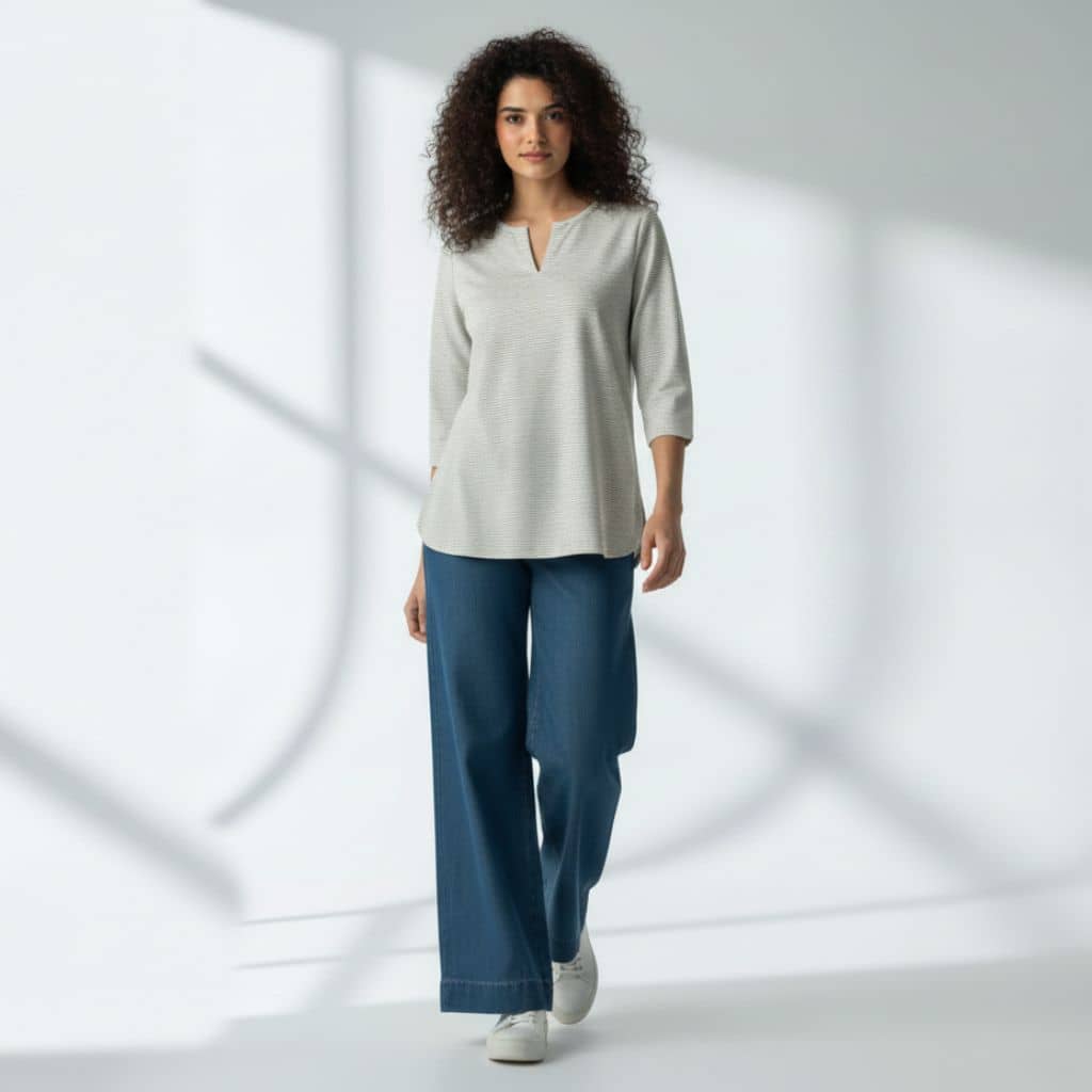 This Nautical Stripes Cotton Short Kurta has a V-Notch Neck and three-quarter sleeves. It has a relaxed fit and regular length. Made from cotton, it is soft and comfortable to wear.